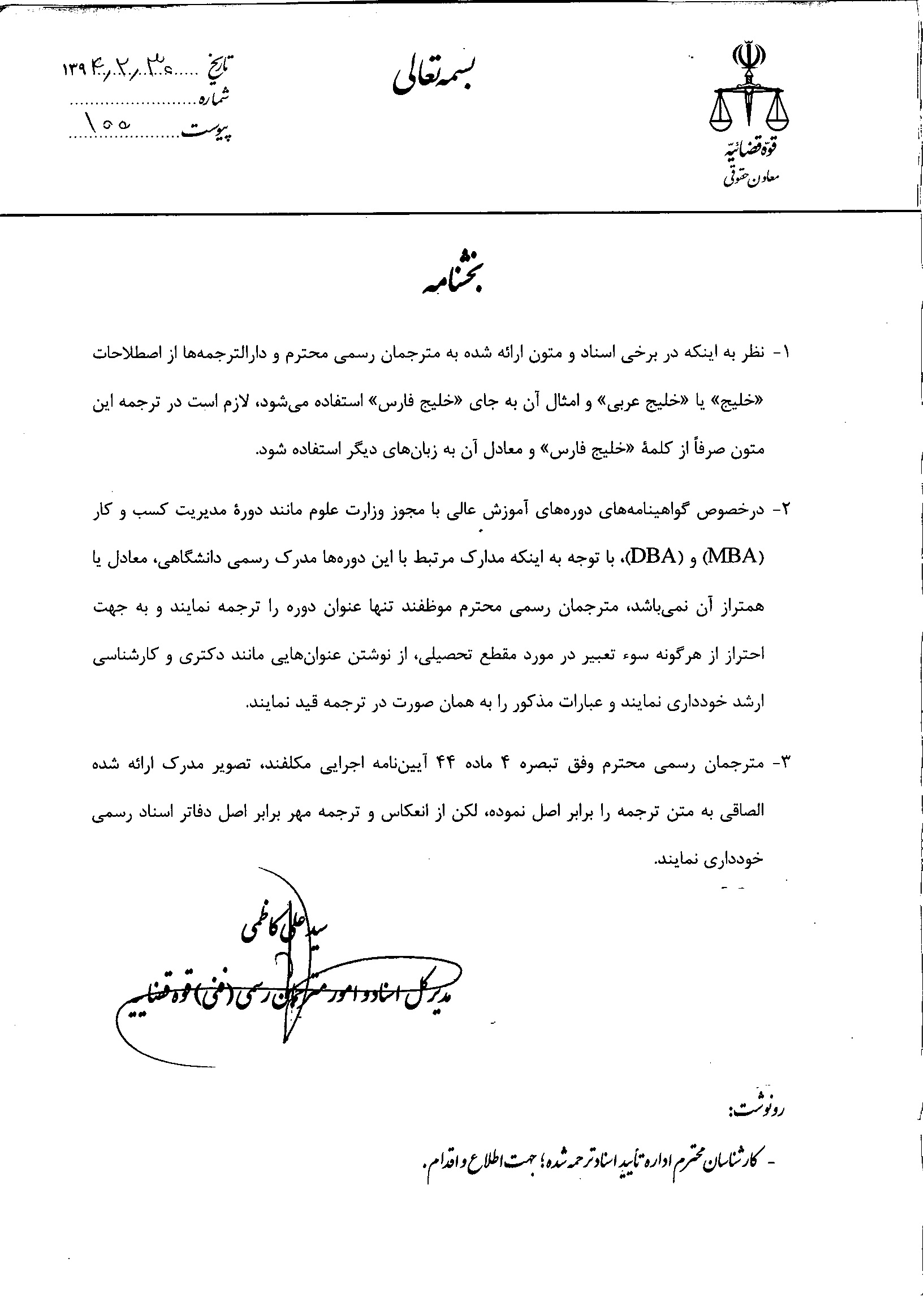 در بخشنامه مورخ 30/2/1394 اداره کل اسناد و امور مترجمان رسمی دستورالعملهای زیر جهت ترجمه ابلاغ شدند.